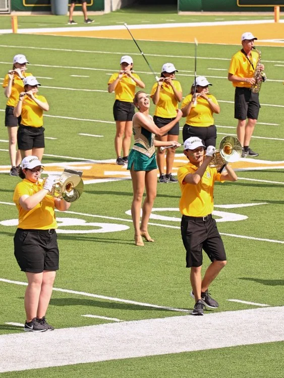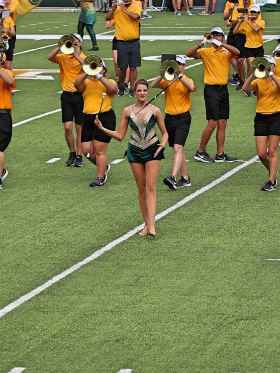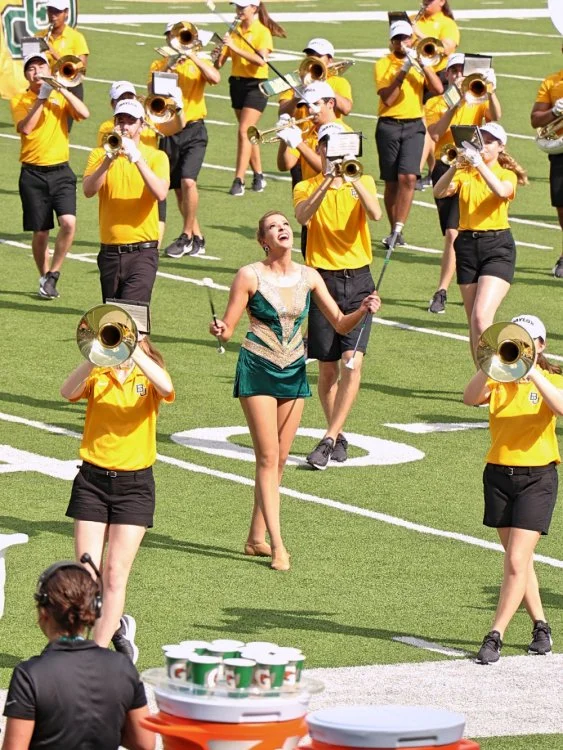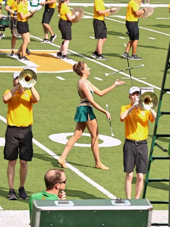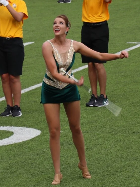 Baylor University Feature Twirler, Caroline Carothers, performs with the Baylor University Golden Wave Band during halftime at the duke versus the Baylor University football game on September 15th, 2018. The game was played at McLane Stadium located in Waco, Texas.