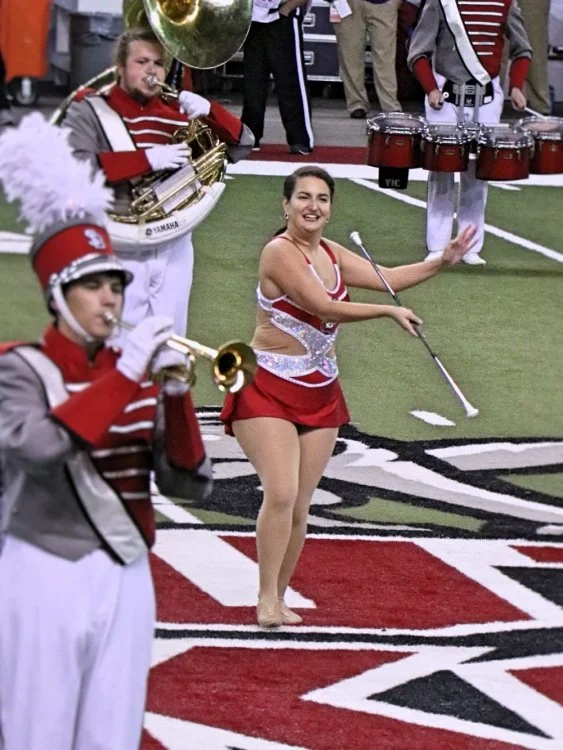 University Of South Dakota Feature Twirler, Clare Fiore, Performs With The University Of South Dakota Marching Band During PreGame At The Northern Iowa VS University Of South Dakota Football Game On October 13th, 2018. The Game Was Played At Dakota Dome Located In Vermillion, South Dakota.